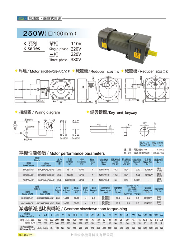 K系列6GN20K感應式馬達250W(100mm)